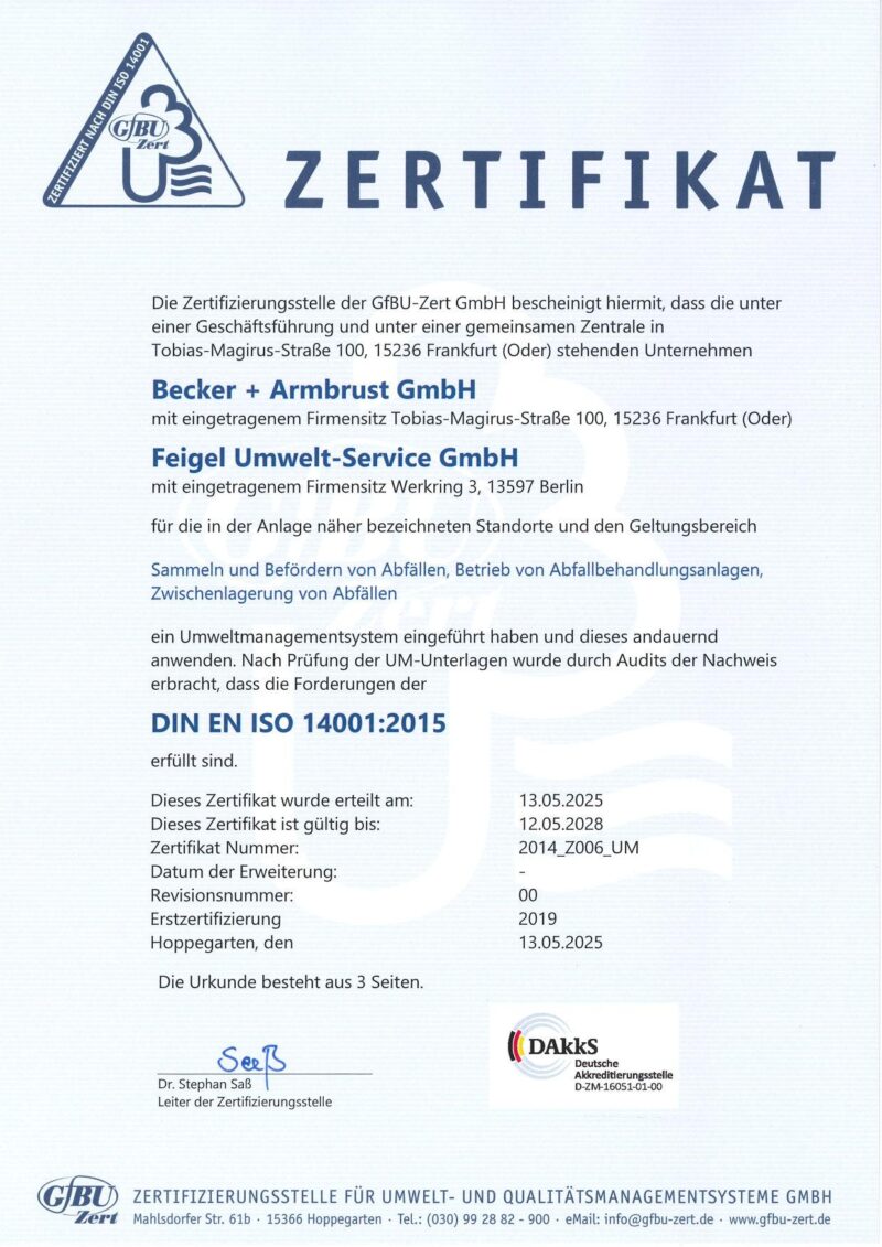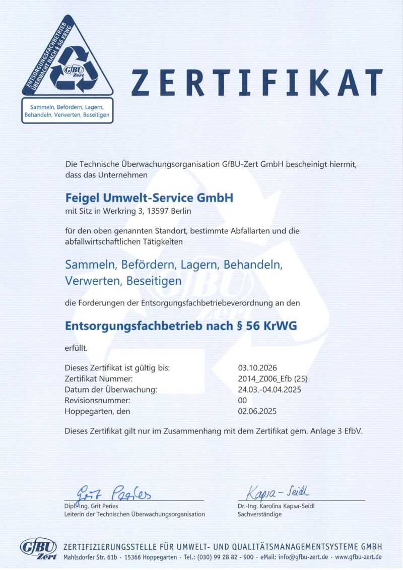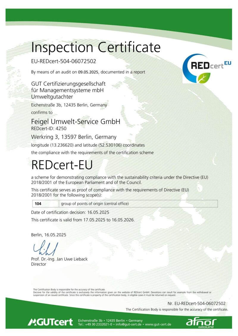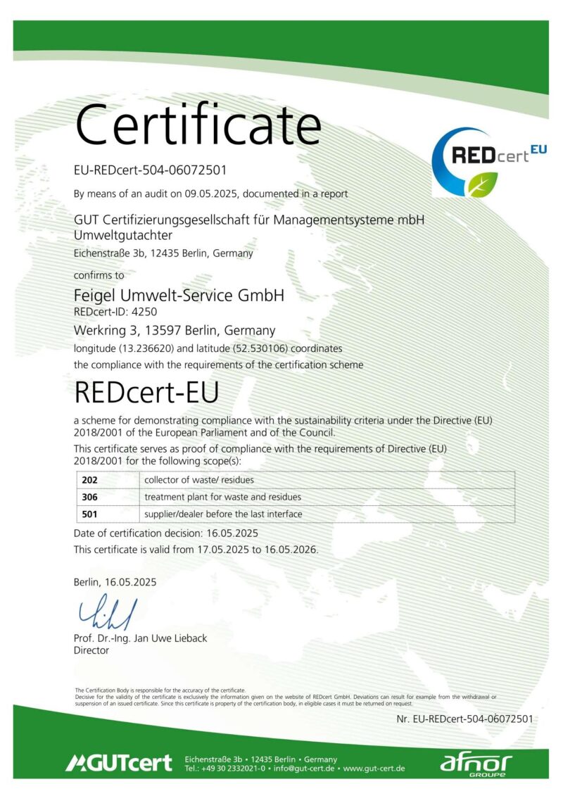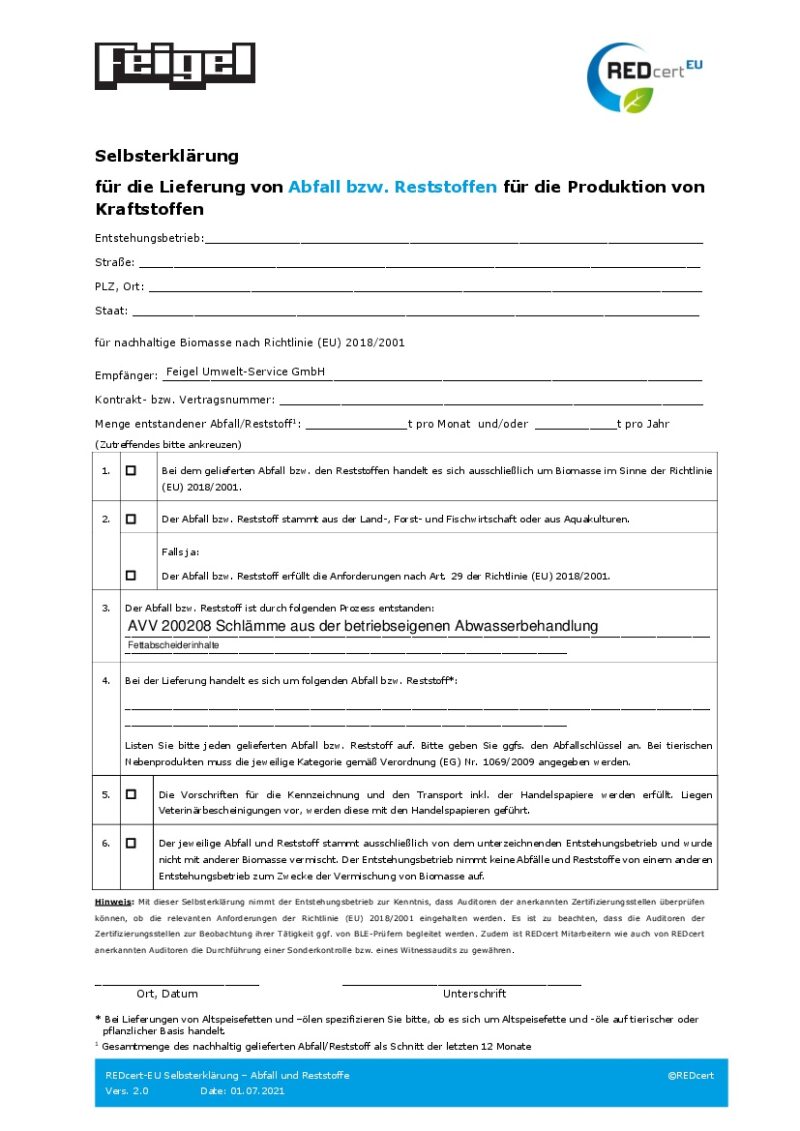 Die Selbsterklärungen für Lieferungen von (Fettabscheiderinhalten) auf dieser Seite sind gültiger Bestandteil des Vertrags zwischen der Feigel-Umwelt-Service GmbH und seinen Kunden. Die Selbsterklärung wird dem Kunden entweder im Vertrag oder in den AGB’s vorgelegt. Ist die Selbsterklärung Bestandteil des schriftlichen Vertrages, gilt sie mit Wirksamwerden des Vertrages als angenommen. Wird die Selbsterklärung in die AGB aufgenommen, so gilt diese als angenommen, wenn der Kunde nicht innerhalb von 14 Tagen schriftlich sein Einverständis widerruft.
